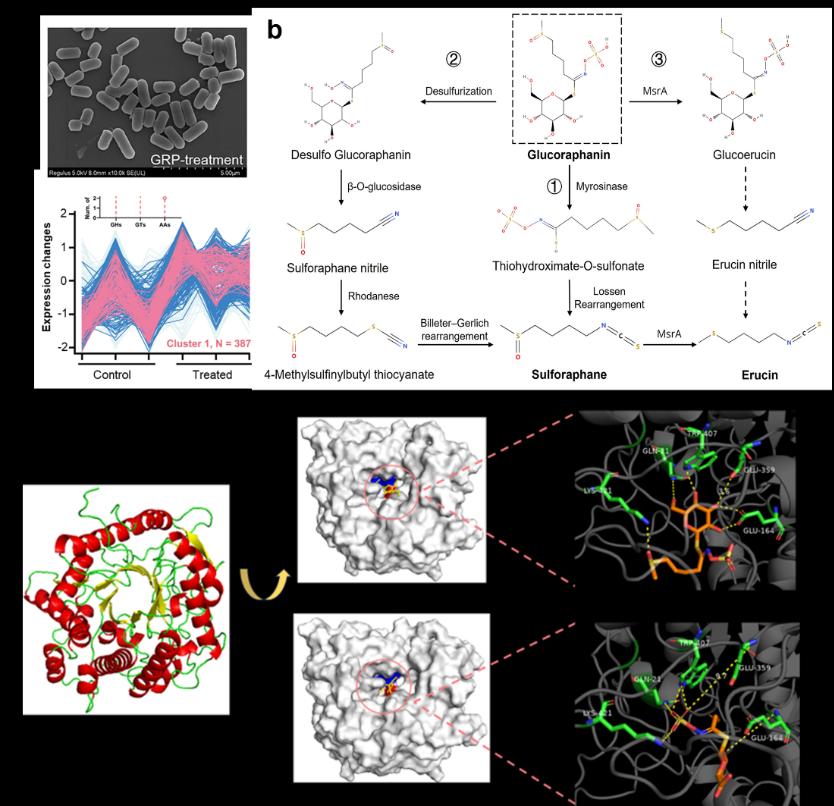 西兰花中的萝卜硫苷被硫代葡萄糖苷酶酶解可生成萝卜硫素(sulforaphane),该化合物具有激活阶段Ⅱ药物代谢酶、激活转录因子NF-E2相关因子(Nrf2)、抑制核转录因子κB(NFκB)、抑制组蛋白去乙酰化酶等多种活性,从而具有抗氧化、调节免疫力等功能。然而,尽管萝卜硫苷稳定性好,但是没有生物学活性;萝卜硫素活性很强,但是萝卜硫素及植物源硫代葡萄糖苷酶的稳定性差(冷藏保存半衰期均少于1个月),限制了其应用。本研究成功分离并筛选出可降解萝卜硫苷的植物乳杆菌ZUST49,12小时内降解率达61.3%。通过转录组和蛋白质组联合分析,鉴定出降解过程中的关键蛋白LpMyr,一种新型硫代葡萄糖苷酶。此外,本研究揭示了该菌株降解萝卜硫苷的3条途径,明确其可经多种中间产物转化为萝卜硫素等功能性物质。