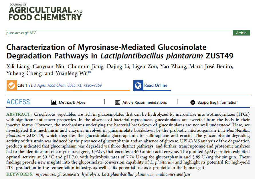 近日,公司天然产物与营养健康团队在国际高水平期刊Journal of Agricultural and Food Chemistry上发表题为“Characterization of Myrosinase-Mediated Glucosinolate Degradation Pathways in Lactiplantibacillus plantarum ZUST49”的封面论文(点击阅读),梁喜丽博士为论文第一作者,吴元锋教授为通讯作者,3044永利集团为第一单位。