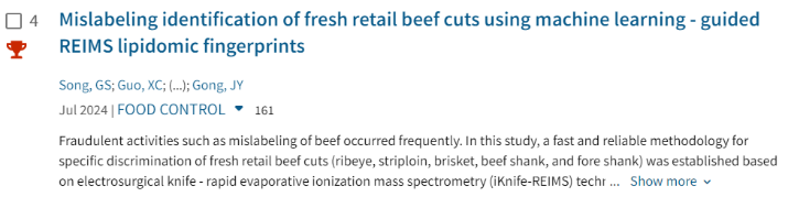 该论文于2024年7月发表在《Food Control》(第一作者为宋恭帅副教授,通讯作者为龚金炎教授)https://doi.org/10.1016/j.foodcont.2024.110401)。牛肉标签造假等欺诈行为严重损害消费者权益。本研究基于iKnife-REIMS融合机器学习算法建立了不同部位零售鲜牛肉(牛眼肉、西冷、牛腩、牛腱和金钱腱)真实性快速鉴别模型,为牛肉真实性鉴别和保障牛肉消费安全提供理论支撑,为其它食品的真实性鉴别提供理论参考依据。