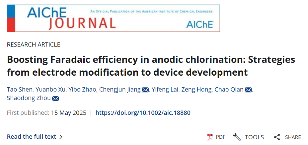 日,​3044永利专用化学品绿色制造团队在化工领域权威期刊AIChE Journal上发表题为“Boosting Faradaic efficiency in anodic chlorination: Strategies from electrode modification to device development”的论文。3044永利集团为该论文第一完成单位。沈涛博士为论文第一作者,蒋成君正高级实验师为论文通讯作者,浙江大学钱超教授和周少东教授为共同通讯作者。