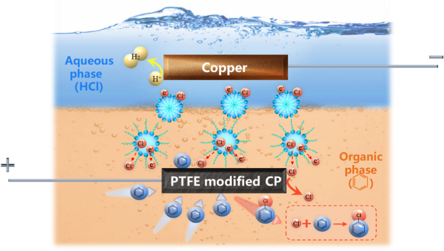 研究团队前期开发了以盐酸为直接氯源的电化学氯化新工艺(ACS Sustainable Chem. Eng. 2024, 12, 3289-3297;CN117947434A)。针对该工艺中盐酸所含水分引发阳极竞争析氧副反应的问题,本团队进一步开发出了上下双层的电化学合成反应新装置,通过物理隔离阳极与水相,显著抑制析氧副反应;采用平行电极布置方式,实现均匀电场强度分布,同时便于调节电极间距及扩大电极面积。此外,引入胶束强化两相间的传质效率。基于上述装置的优化设计,该研究显著提升了电化学氯化反应的法拉第效率,推动电能与盐酸的高效协同利用。