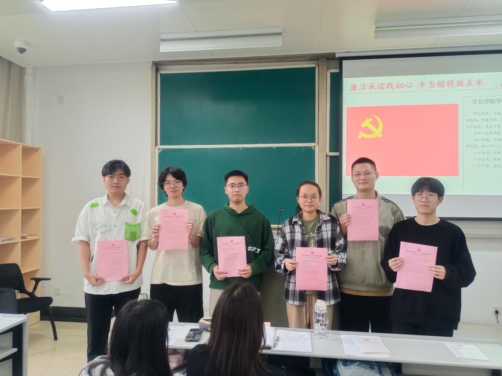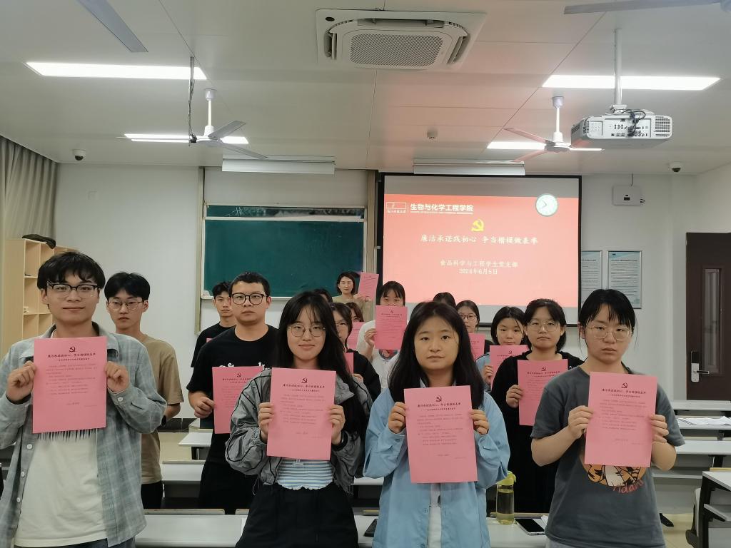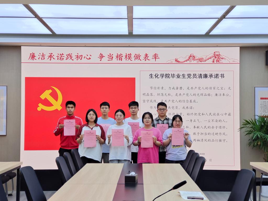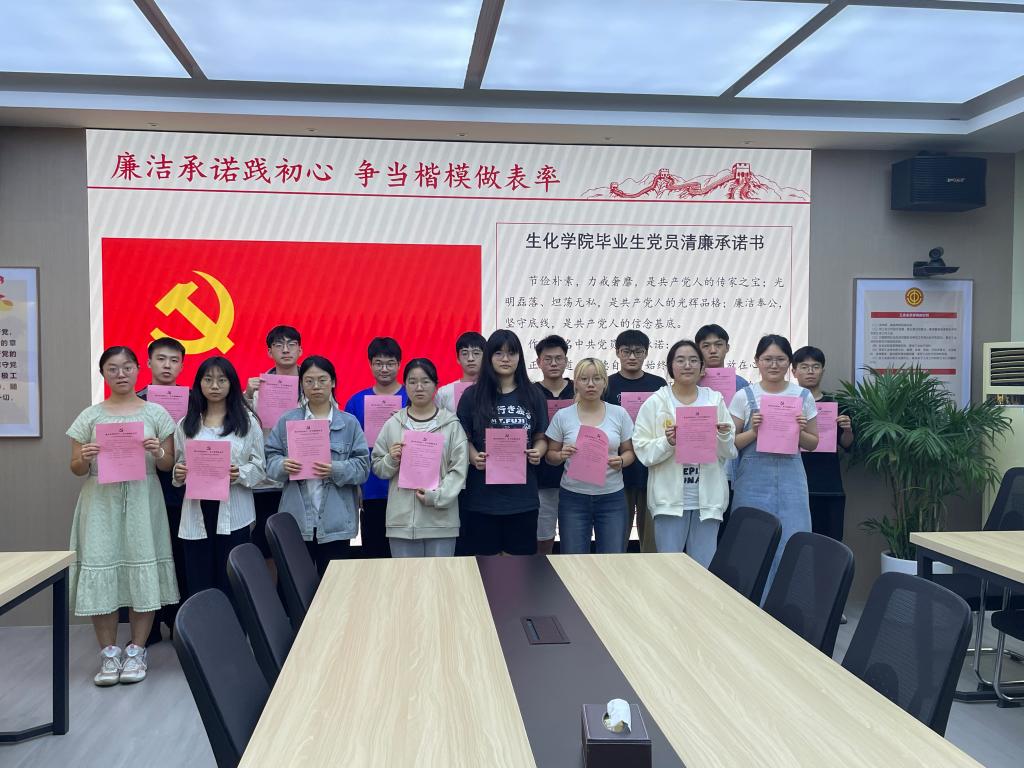 “作为一名中共党员,我承诺:正心明道,怀德自重,始终把党和人民放在心中最高位置……”202465日-6日,生化公司党支部的毕业生党员们面对党旗郑重承诺。洪亮的声音,坚定的眼神,传递出即将踏上工作岗位党员们的廉洁信念。
