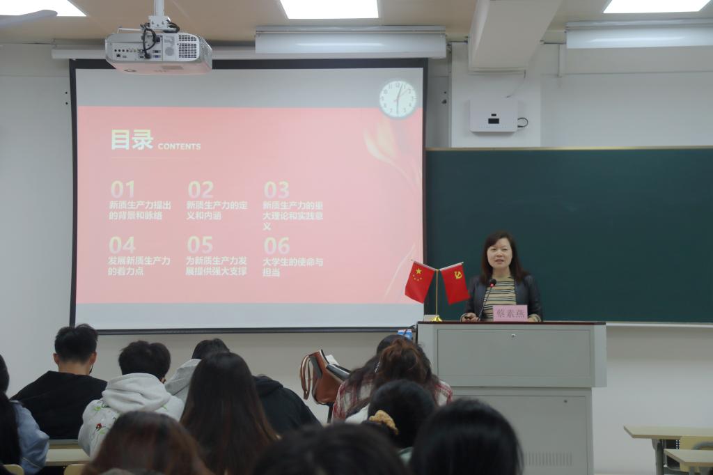 蔡素燕老师以华为新能源汽车为例引出新质生产力的概念,阐述了发展新质生产力推动高质量发展的重大意义,指明了发展新质生产力的关键举措。新质生产力是创新起主导作用,摆脱传统经济增长方式和发展路径,具有高科技、高效能,高质量特征,符合新发展理念的先进生产力质态。讲述中,蔡素燕老师还引用新兴材料碳纤维的广泛应用等实例让大家更深刻地认识到发展新质生产力的重要实践意义及其巨大的发展潜力。