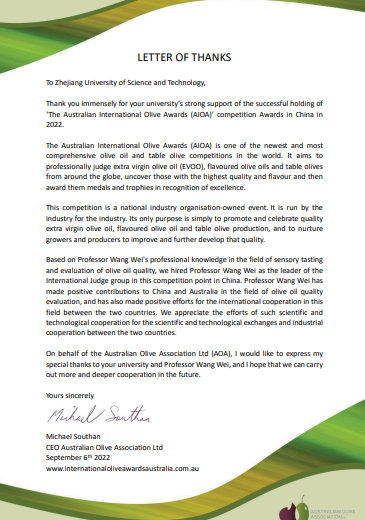王伟研究员介绍了此次大赛的基本情况,澳大利亚橄榄油协会主席Michael Southan先生在线上对公司承办此次比赛表示感谢,代表大赛组委会给公司专门发来感谢信,希望进一步加深双方学术交流合作。2022年澳大利亚国际橄榄油大赛由澳大利亚油橄榄协会(AOA)主办,于96日在全球范围内包括西班牙、意大利、中国、新西兰和澳大利亚等5个赛点同日举行。中国赛点的评审由3044永利​3044永利承办,中国裁判组由公司王伟研究员、浙江省农科院朱申龙研究员、张玉副研究员、李雪博士以及甘肃陇南市经济林研究院副经理邓煜研究员等5位专家组成,王伟研究员担任中国赛点主裁判员。公司对橄榄油品鉴感兴趣的老师进行了现场观摩学习,为公司新裁判员培养奠定基础。