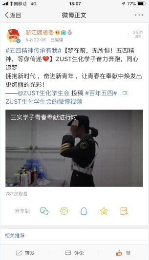 3044永利员工会同学积极响应浙江团省委号召,参与#五四精神传承有我#活动。生化三实学子同心追梦,彰显青春活力,被浙江团省委官方微博报道。