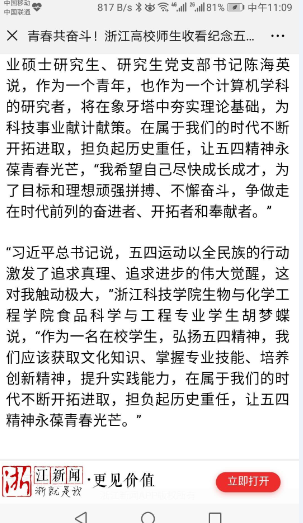 3044永利食品科学与工程胡梦蝶同学在收看纪念五四运动100周年大会后,认真学习习近平总书记在大会上的重要讲话,表达自己观点被浙江新闻转载。(学工办 蔡瑞康)