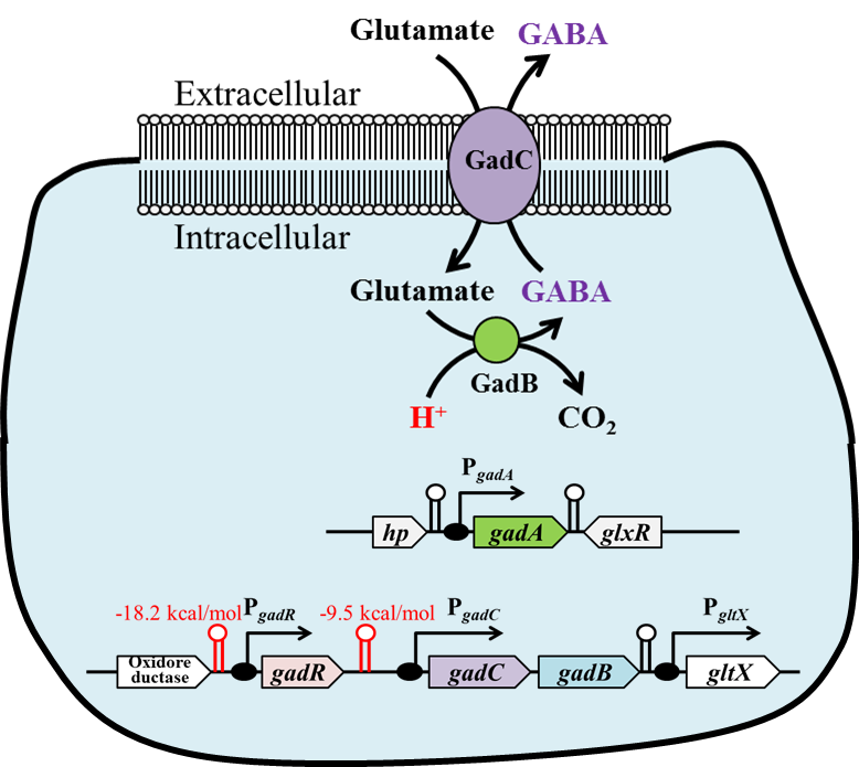 此外,为从细胞水平上阐明L. brevis CGMCC 1306的GABA高产机理,研究人员通过实时荧光定量PCR和基于温敏性pGhost4系统的染色体无痕敲除技术等手段进一步解析了该菌株染色体上gad operon的转录表达调控机制,并探讨了GAD system中GadA,GadB及GadC等关键蛋白在细胞抵御酸胁迫及GABA合成过程中的作用。在此基础上,通过代谢工程手段实现了基于L. brevis细胞工厂的GABA高效合成。该研究不仅揭示了L. brevis高效合成GABA的机理所在,也为实现食品级GABA的工业化生产提供了新的视野。相关研究成果已在线发表于微生物代谢工程领域重要期刊《Microbial Cell Factories》上(https://doi.org/10.1186/s12934-018-1029-1;5-Year Impact Factor: 4.295),青年教师吕常江博士为第一作者,黄俊教授与浙江大学梅乐和教授为共同通讯作者。